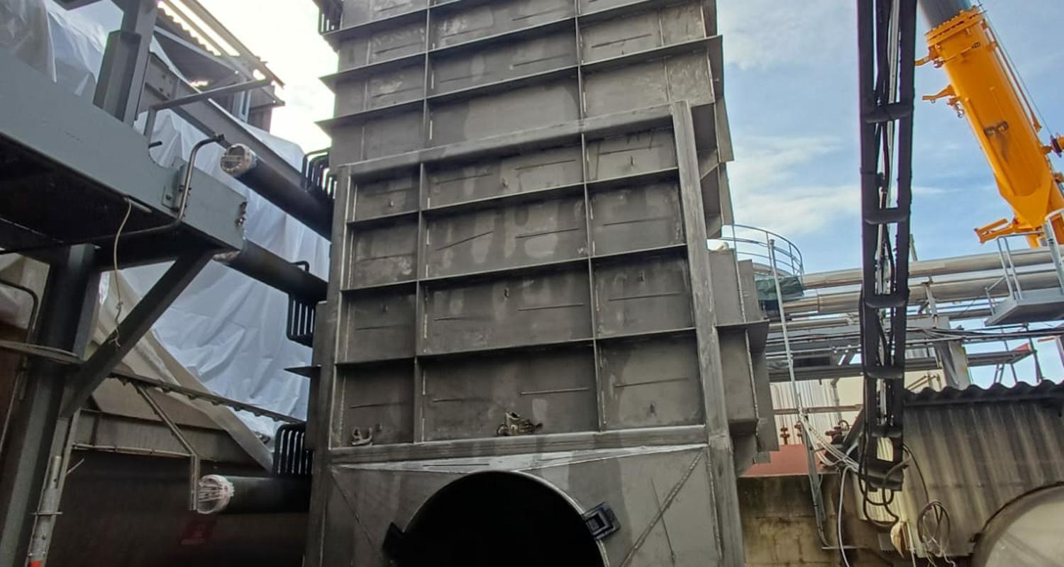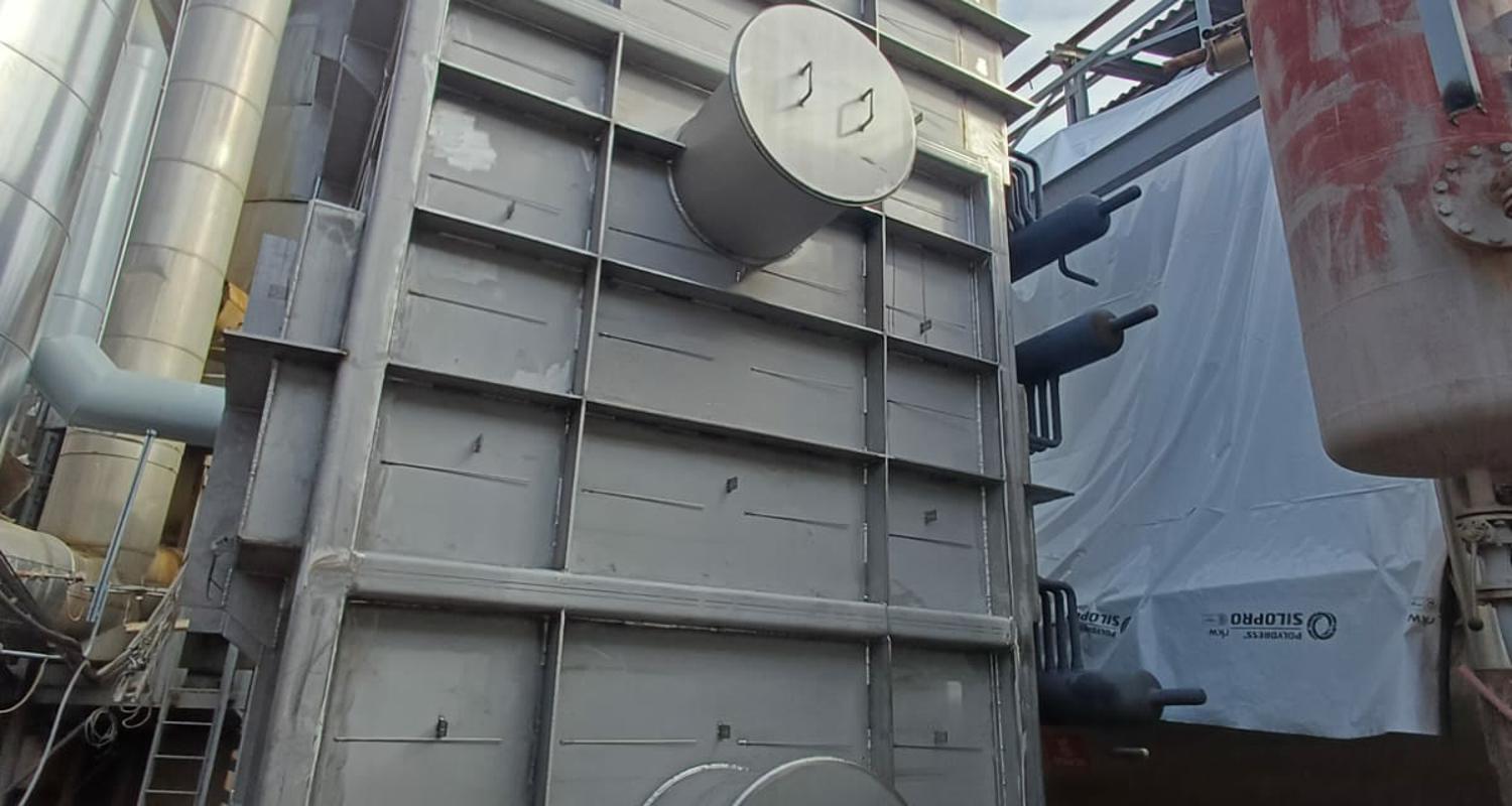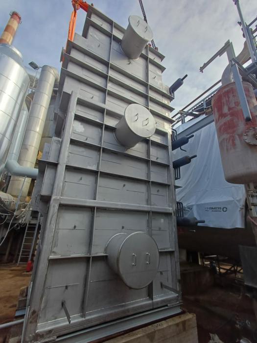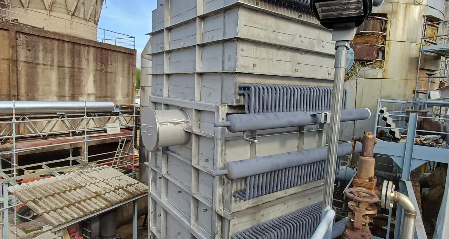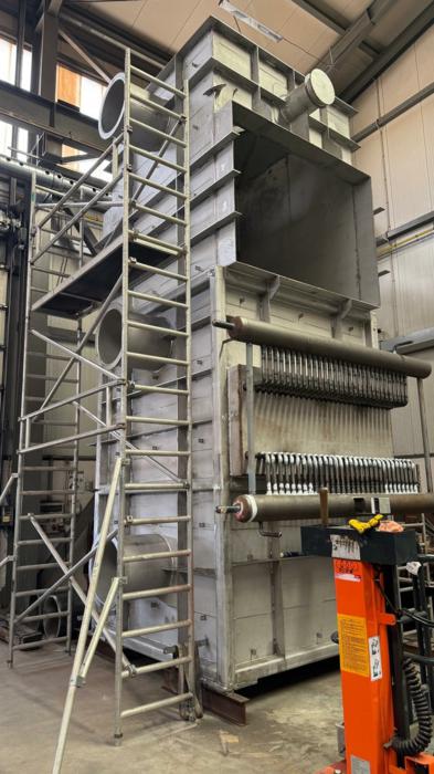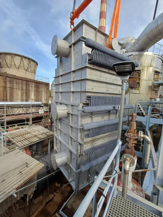 Uspravna kvadratna konstrukcija dimenzija 7.018 × 3.380 × 3.670 mm, mase 16 t, s cjevnim snopovima od 10CrMo9-10 i spiralnim orebrenjem. Predviđen za rad s parom 37 bar(g) / 450°C te za procesne plinove SO₂/SO₃ do 635°C, nastale izgaranjem sumpora u procesu proizvodnje.