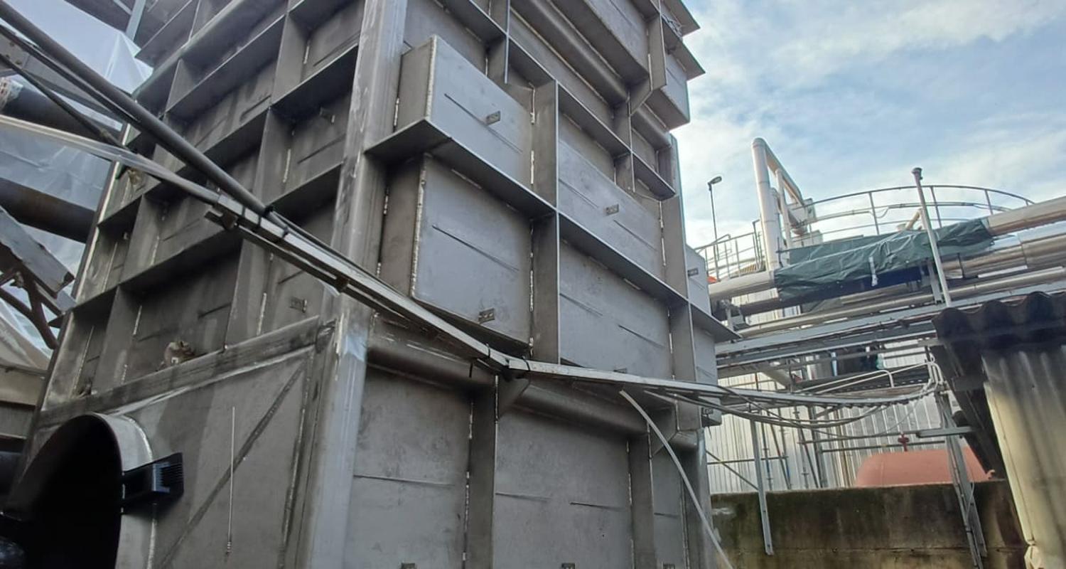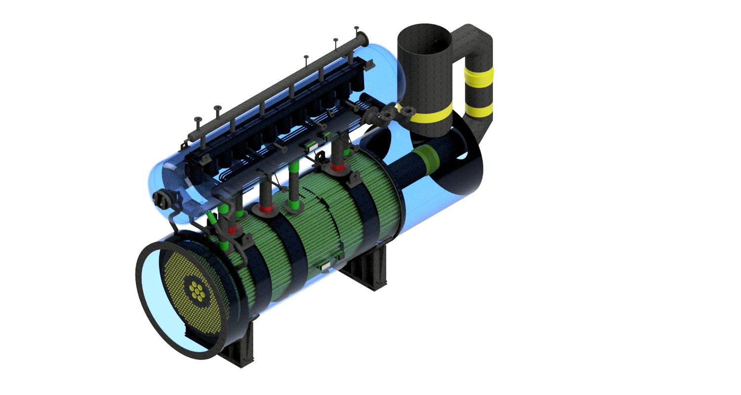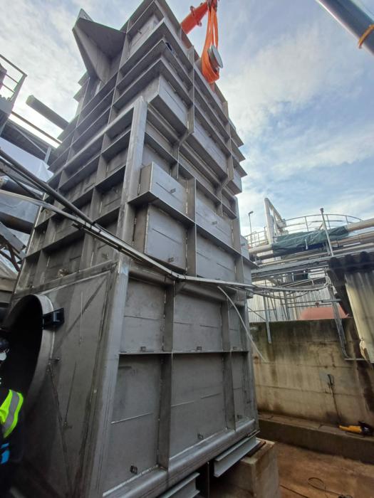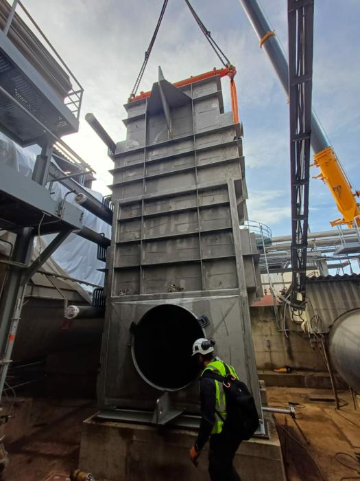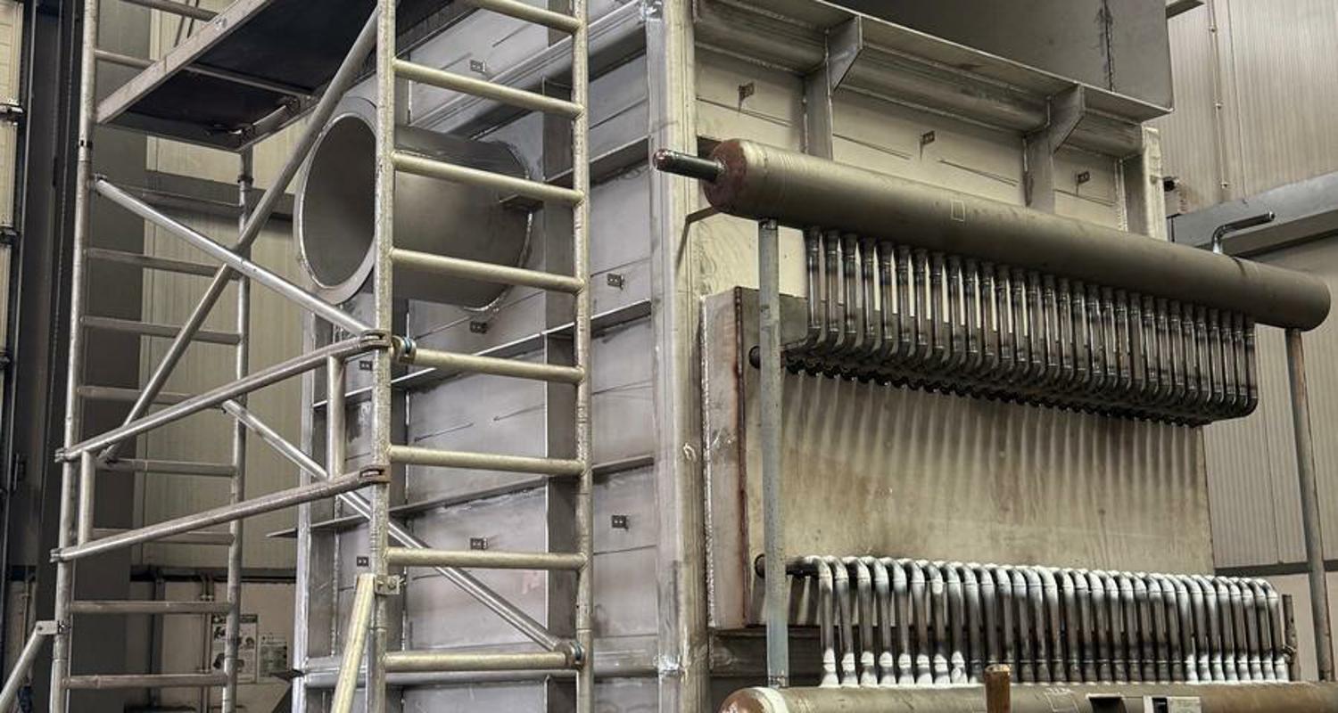 Uspravna kvadratna konstrukcija dimenzija 7.018 × 3.380 × 3.670 mm, mase 16 t, s cjevnim snopovima od 10CrMo9-10 i spiralnim orebrenjem. Predviđen za rad s parom 37 bar(g) / 450°C te za procesne plinove SO₂/SO₃ do 635°C, nastale izgaranjem sumpora u procesu proizvodnje.